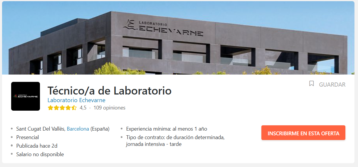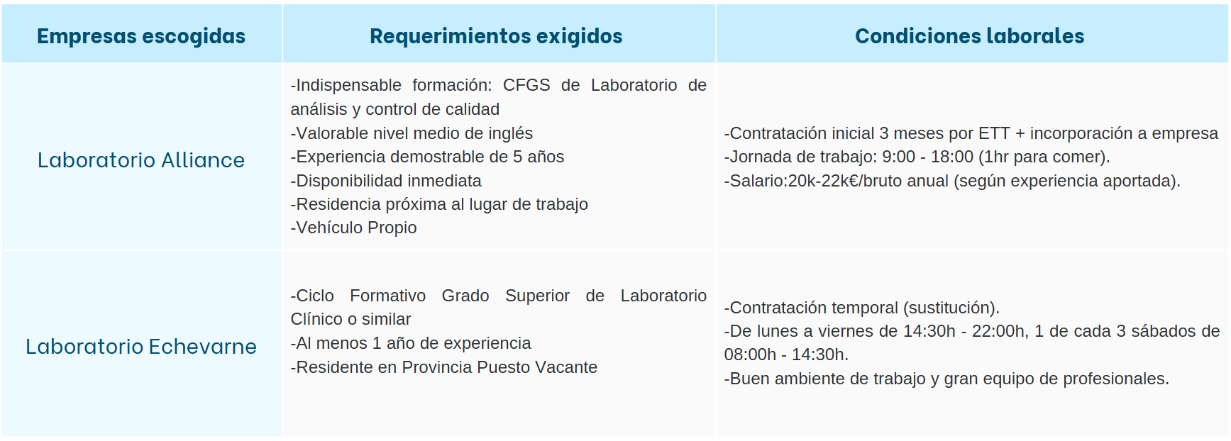 En este apartado buscare dos empresas que actualmente estén buscando trabajadores como Técnico de laboratorio clínico y biomédico y colocare en una tabla requisitos y condiciones que requieren para poder trabajar en ellas.