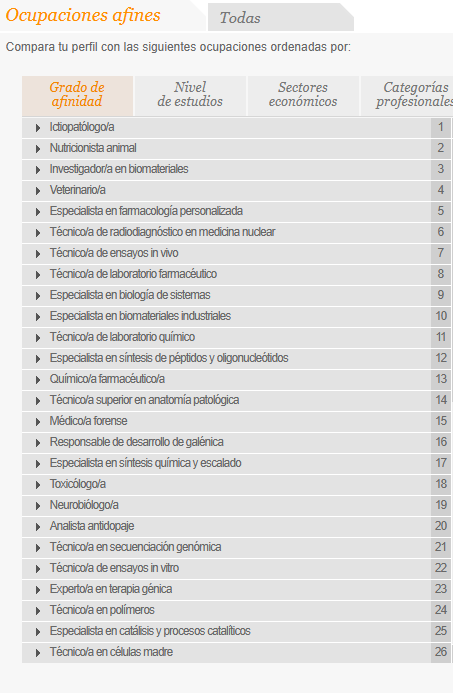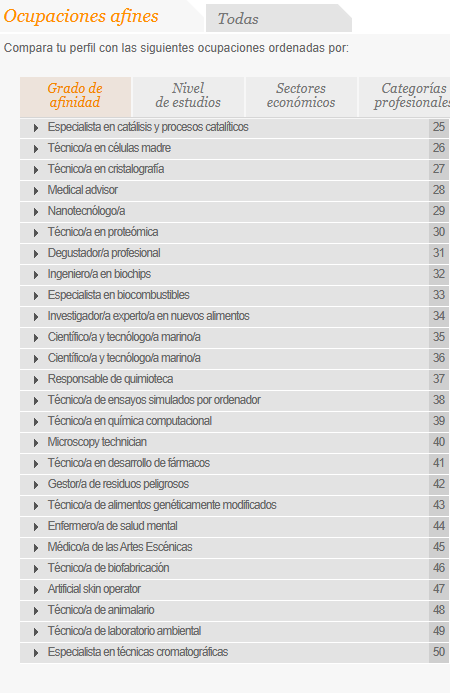 También han salido opciones que me han llamado la atención como por ejemplo: Técnico en secuenciación genómica, técnico de laboratorio farmacéutico, neurobiólogo, técnico en células madre y algunas mas sobre todo si están relacionadas con la investigación, todo lo relacionado con las células, enfermedades de la sangre y la genética, diría que eso serian los sectores que mas me atraen.
